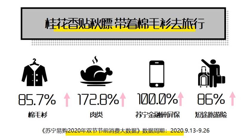 “桂花香,贴秋膘”,《苏宁易购2020年中秋国庆节前消费大数据》显示,秋分后销量大火的不仅是“秋天的第一杯奶茶“,还有”秋天的第一块红烧肉“。