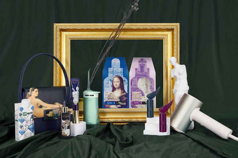 在中国,经典的艺术文创IP同样正在受到越来越多品牌的青睐。在本次发布会现场,玛丽黛佳、欧莱雅、伊利、素士、AHC、A.cloud等品牌首次展示了各自与卢浮宫合作的授权商品:从胜利女神翅膀造型的口红到结合维纳斯主题的眼影盘,再到蒙娜丽莎主题的挎包……每一件商品都与卢浮宫的艺术作品进行了创意融合,仿佛将卢浮宫搬到了千里之外的中国;而品牌们亦能在IP的情境里结合自我主张,表达出新的品牌精神和内核。