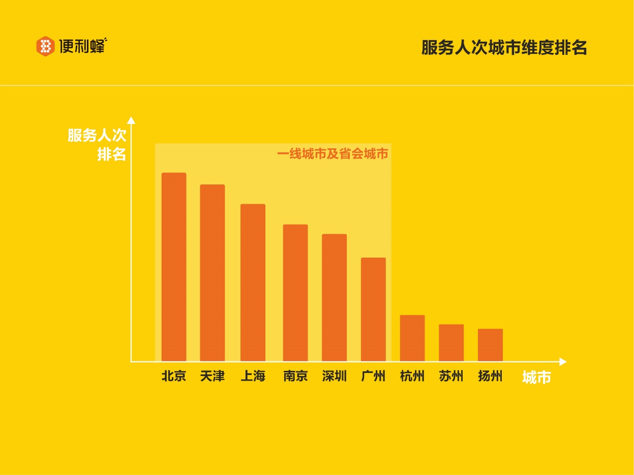 数据显示,便利蜂在全国20个城市开设了近1600家门店。10月1日当天,服务人次排名前列的是北京、天津、上海、南京、深圳和广州等一线城市及省会城市。