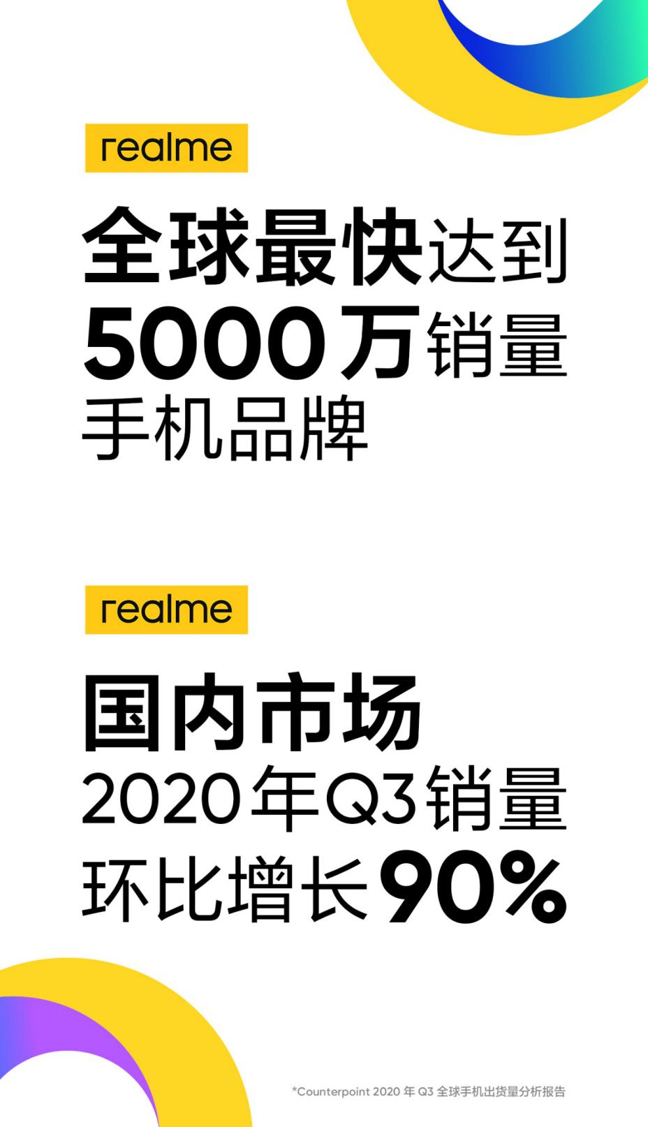 速途网10月30日讯(报道:乔志斌)今日,市场研究机构Counterpoint发布的2020年第三季度全球智能手机出货量统计数据显示,realme的全球智能手机销量突破5000万台,仅用了9个季度(2018 Q3-2020 Q3),成为全球最快达到该里程碑销量的手机品牌。realme 2020年第三季度出货量为1480万台,创历史新高,realme也连续4个季度全球增长最快,稳居全球第七。同时,国内市场第三季度表现出强劲的增长势头,销量环比增长90%。