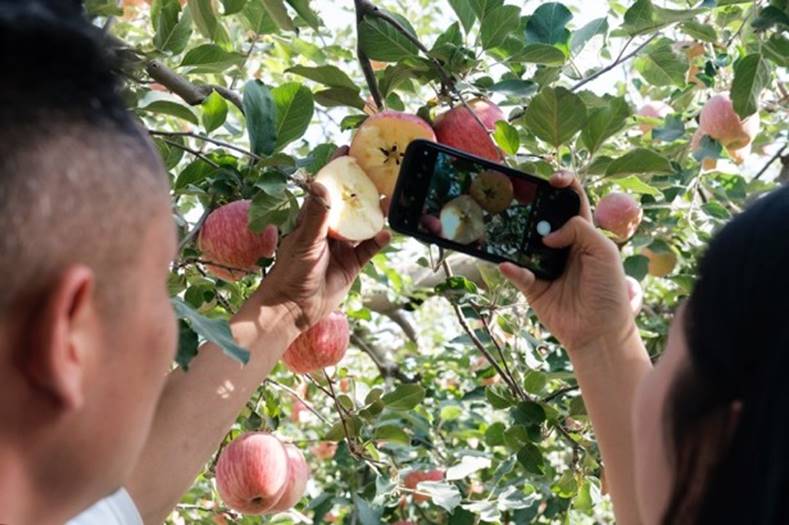 ▲拼多多新农人代表李成俊正在给自己的店铺拍摄产品样图,他的产品全部来自当地最好的果园,苹果个个都是“冰糖心”。(穆功摄)