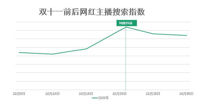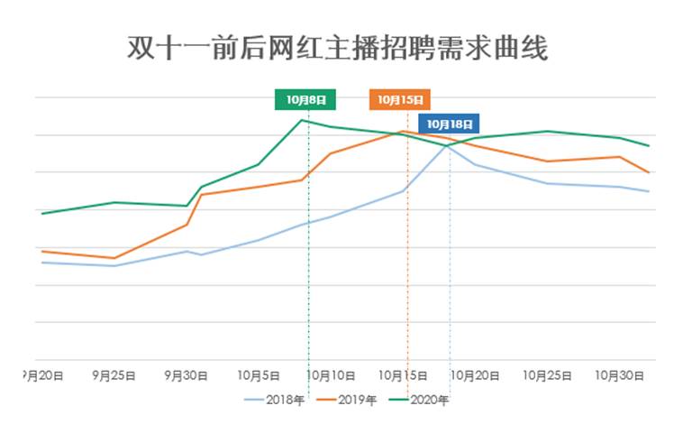 双十一的影响同样作用在求职者人群。自10月13日起,拉勾招聘上“网红”“主播”“艺人”“演员”等关键词搜索指数开始呈现上升趋势,至10月21日达到顶峰,是日均搜索指数的2.4倍。