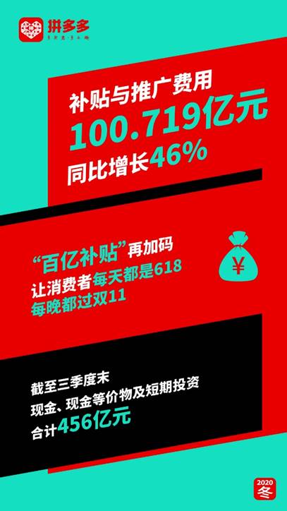 财报还显示,2020年第三季度拼多多的销售与市场推广费用约100.72亿元,同比增长46%。这说明,拼多多继续加大了在用户端的投入力度,比如“百亿补贴”的长期在线。