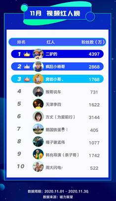 “视频红人榜”中,“二驴的”“疯狂小杨哥”“房岩小哥、”分别位居前三,此外,也有多位新晋达人入榜。