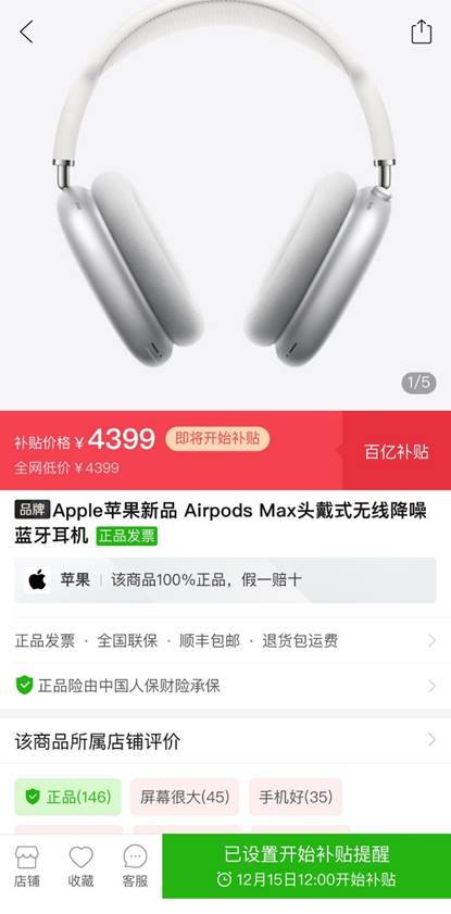 拼多多AirPods百亿补贴负责人表示,参加百亿补贴的AirPods Max本月20号即可发货,网友们纷纷表示已经设置好了“12月15日的补贴提醒”,希望在市场货源不充裕的情况下抢到首发新品。