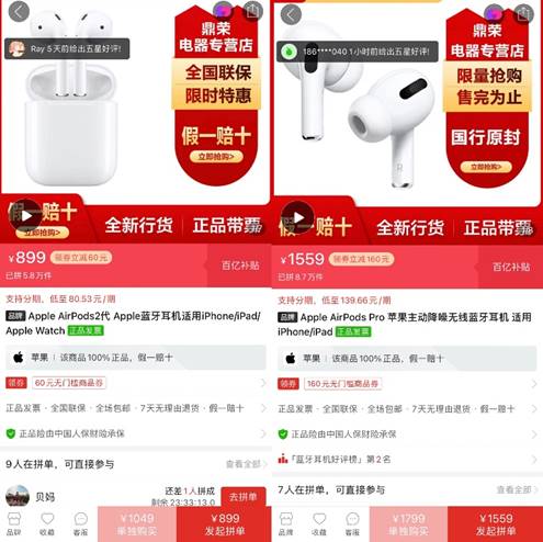 ▲AirPods2和AirPods Pro享受百亿补贴价,在拼多多买苹果耳机渐成用户消费习惯