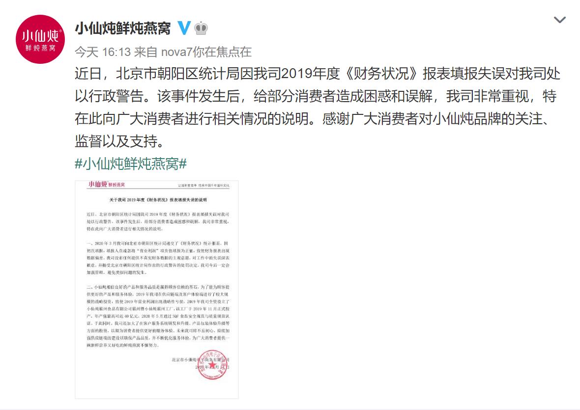 速途网12月14日讯(报道:王璇)今日,“网红”燕窝品牌小仙炖针对“瞒报超3000万亏损遭处罚”一事做出回应。小仙炖方面称,此事件出现的原因系该公司报表填报人员因初次填报,疏忽将“营业利润”项负值填报为正值,致使财务报表出现数据偏差,该公司没有任何提供不真实财务数据的主观意愿,对工作中的失误深表歉意,并接受北京市朝阳区统计局作出的行政警告处罚决定。