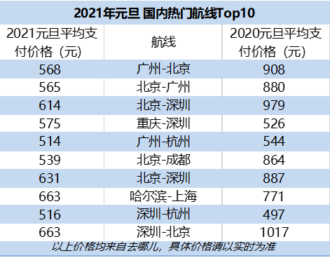 去哪儿数据显示,2020年低价机票趋势在2021元旦得以持续,2021年元旦国内机票平均支付价格为615元,比去年同期便宜137元。广州-北京成为2021年元旦最热门航线,平均支付价格568元,比2020年元旦时便宜340元。