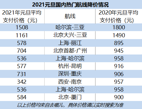 去哪儿平台上,2021年元旦,上海-丽江平均支付价格578元,2020年元旦时894元;哈尔滨-三亚平均支付价格为1508元,比去年便宜近300元;西安-北海的平均支付价格为603元,2020年元旦时为711元。北京-厦门航线2020年元旦的平均支付价格为900元,便宜了315元。