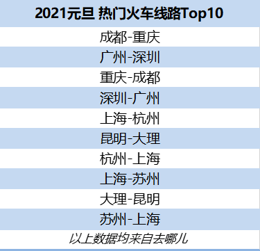 去哪儿平台上的前10条热门火车线路皆往来于城市群之间,成都往来重庆、广州往来深圳、上海往来杭州等多条城际线路位列其中。