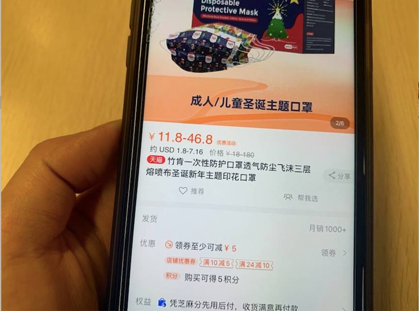 “今年平台出口的国产圣诞用品比往年更加丰富,商品数同比增长50%,其中疫情相关的圣诞商品如圣诞款口罩卖得很好,销往90多个海外国家和地区,儿童款销量占到了近5成。”据天猫淘宝海外家居百货行业负责人舒卫祥介绍,澳大利亚、美国、加拿大消费者买圣诞款口罩较多,美国消费者还热衷买圣诞服饰,新加坡、日本消费者偏爱圣诞礼盒,马来喜欢圣诞袜。