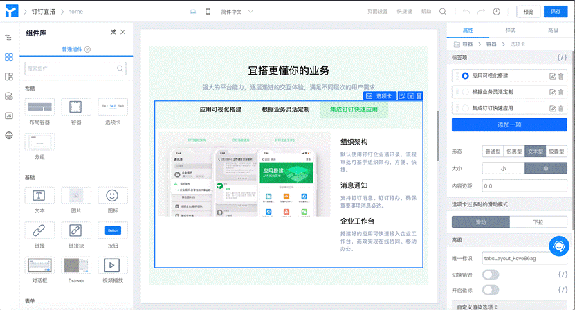 钉钉宜搭上提供了超过100项图形化的开发组件,集合应用页面编排、业务模型编排、业务流程编排、服务编排及数据展现与分析等五大核心能力,用户“拖拉拽”开发组件,即可完成应用的搭建,不懂代码的业务人员,如HR、财务也可成为开发者。