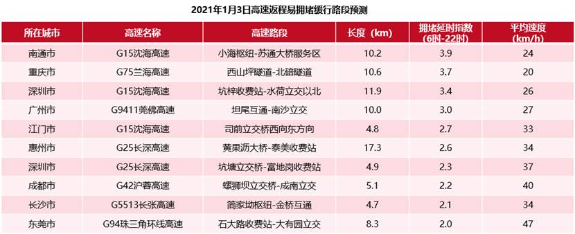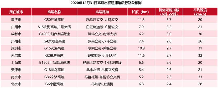 报告显示,出程方面全国高速的易缓行路段较为分散,2020年12月31日出程易拥堵缓行的高速路段前三依次为:G50沪渝高速重庆段,预计拥堵延时指数为3.7,平均车速约为20千米/小时;其次是S15沈海高速广州支线、G4202成都绕城高速。