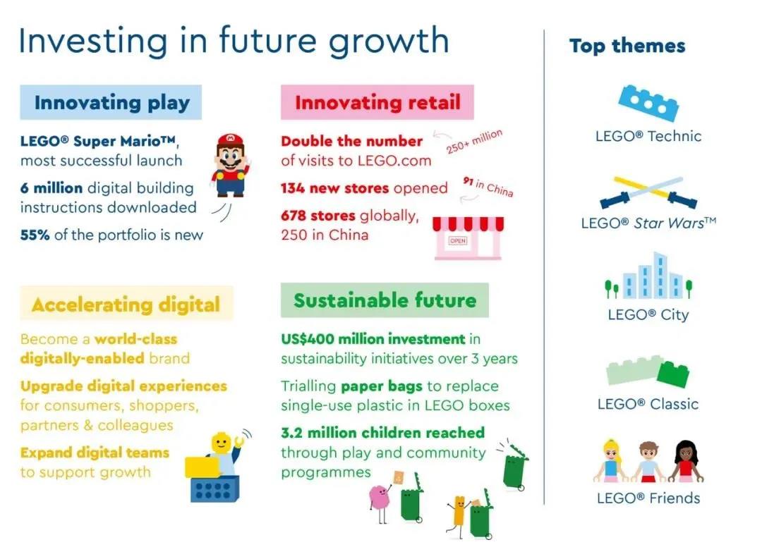 2020年,乐高集团共开设了134家零售店,其中91家位于中国。截止2020年年底,乐高集团在全球已拥有678家品牌零售店。该集团计划在2021年再开设120家品牌零售店,其中80家将位于中国。