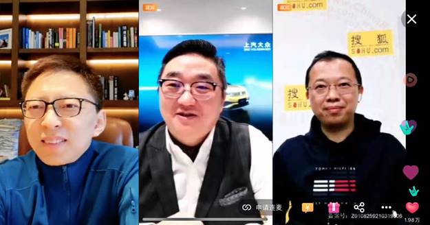 速途网3月13日消息(报道:李楠)昨天下午15时,《Boss1+1》第十七期准时开播,搜狐公司董事局主席兼CEO张朝阳、上汽大众汽车有限公司销售与市场执行副总经理贾鸣镝,与搜狐网副总编辑晏成一起,分别从北京、上海两地登陆直播间,三屏连线,以“ID‘亮剑’,比赛才刚刚开始”为主题,畅聊未来汽车生活有多酷。