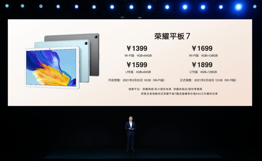 荣耀平板7 提供WiFi和LTE两个版本,分别有4GB+64GB、4GB+128G两个内存版本供选择,WIFI版本售价分别为1399元和1699元,LTE版本售价分别为1599元和1899元。3月26日10:08,WiFi版将在线上线下全平台开售,用户可通过荣耀商城及各大授权电商平台或前往荣耀线下体验店、荣耀授权零售门店进行购买。