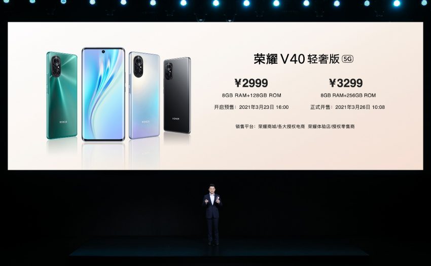 荣耀V40轻奢版拥有幻夜黑、蓝水翡翠和钛空银三种配色,提供8GB+128GB、8GB+256GB两个内存版本,售价分别为2999元和3299元。3月26日10:08在线上线下全平台开售,用户可通过荣耀商城及各大授权电商平台或前往荣耀线下体验店、荣耀授权零售门店进行购买。