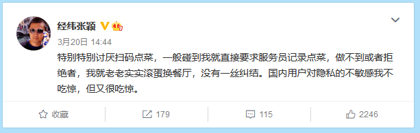 值得一提的是,经纬中国创始管理合伙人张颖也在关注此事,并在其微博上公开炮轰“扫码点单强制关注公众号”存在侵犯隐私行为。