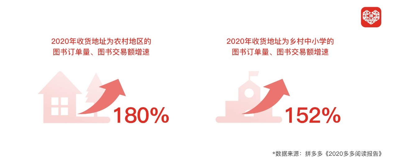 数据显示,去年有超过4亿人次通过拼多多购买图书,其中来自农村地区的图书购买订单量、交易额同比增长超过180%,其中来自乡村中小学的订单量、交易额增长超过152%。通过拼购模式,让知识以图书为载体传遍中国,不断缩小着知识阅读的城乡鸿沟。