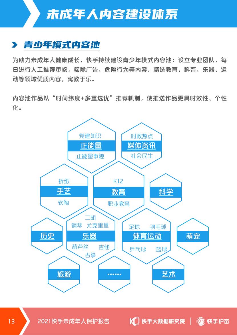 在未成年人内容建设方面,快手持续升级青少年模式内容池,设立专业团队,每日进行人工推荐审核,精选手艺、乐器、球类运动、教育、历史、科学、萌宠、旅游等40余类适合未成年人观看的正向内容,并引入优质政务内容和媒体资讯,提高青少年模式内容丰富度。