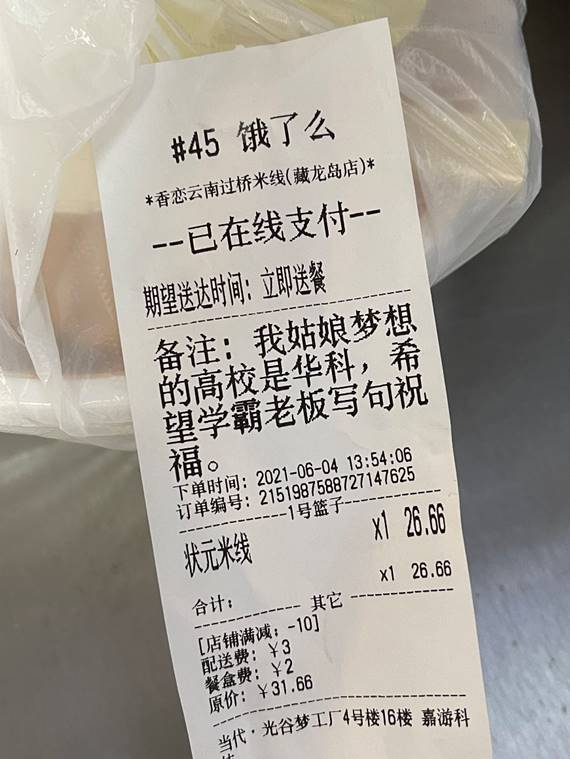 很多家长在点外卖的时候,也都会备注强调是给高考的孩子吃,“一定送今天最新鲜的叉烧肉”“务必送现做新鲜的食材”。