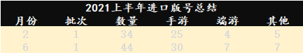 相比于2020年全年进口版号公布的97个(发布日期为3月、8月、12月)。去年上半年仅有一批进口版号过审,今年的进口版号数量呈上升趋势。