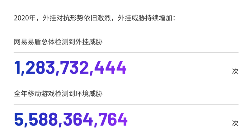 2020年,外挂对抗形势依旧激烈,外挂威胁持续增加。《白皮书》透露,2020 年,网易易盾总体检测到外挂威胁 1,283,732,444 次,全年移动游戏检测到环境威胁 5,588,364,764 次。
