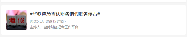 而此次的举报纠纷一事,在微博上也有#矿机巨头董事长实名举报上市公司#、##华铁应急否认财务造假职务侵占#等多个话题,且阅读量短时间内已达5.5万。