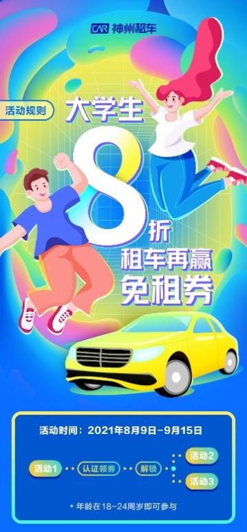 根据神州租车APP页面介绍显示,8月9日至9月15日活动期间,年龄在18-24周岁的用户可登录神州租车APP完成注册及信息认证,可限量领取大学生特权“8折券”。认证之后,可解锁“租2免1”、“每满1000元返8折券”等优惠活动。本次活动的优惠券适用于全国各直营城市门店。另外,如为新注册的用户,还可获得120元新人代金券。