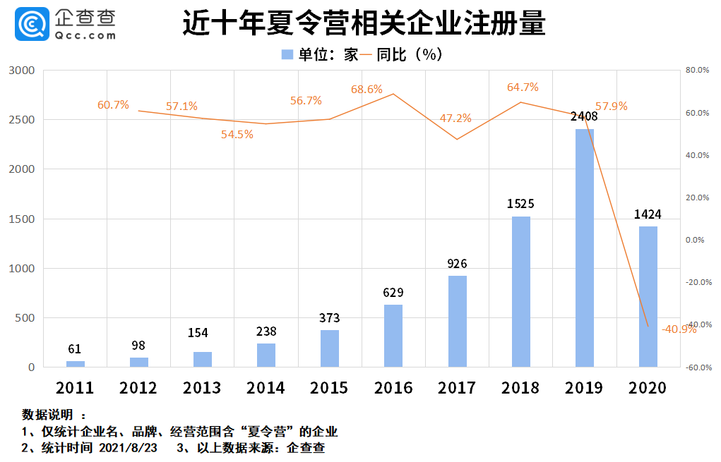 近10年来我国夏令营相关企业年注册量逐年攀升。企查查数据显示,2018年注册量首次突破1500家,同比增长64.7%;2019年突破2400家,同比增长57.9%;2020年受疫情等因素影响,注册量出现下跌,为1434家,同比下跌了40.9%。