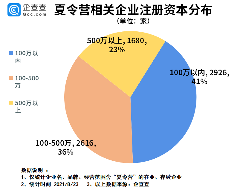 从注册资本分布来看,企查查数据显示,目前我国现存的夏令营相关企业注册资本主要集中在500万以内,其中注册资本在100万以内的企业占比41%;100-500万之前的占比36%;500万以上的仅占比23%。