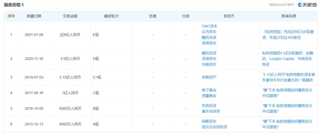 今年7月,和府捞面宣布完成由CMC资本领投,新股东众为资本、老股东腾讯投资、LongforCapital跟投的近8亿元E轮融资。和府捞面表示,该轮融资主要用于深入布局全产业链体系、新品牌打造、渠道建设及数字化能力构建等方面。此前,和府捞面已累计获得了约8.5亿元融资。