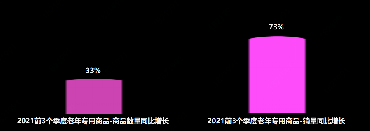 老年适用品是指各品类中专门为满足老年群体需求制作的商品,比如老年服饰、老年食品、老年营养品等。整体来看,2021年前三个季度老年适用品的数量同比增长33%,销量同比增长73%,市场需求更旺盛。