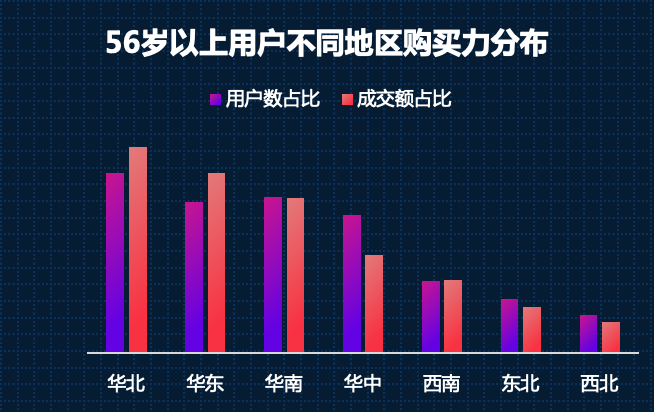 受疫情影响,银发人群数字化进程明显加快。老年用户网购的销量同比增长4.8倍,华北、华东地区成交额占比高于用户数占比,银发族网购的购买力更强。