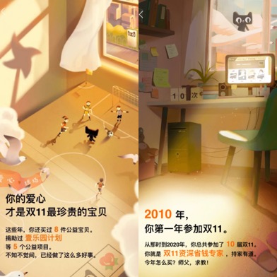 速途网获悉,这是天猫双11首次发布购物车回忆录。相比于其他账单型H5,这份回忆录弱化了下单金额,更聚焦在引发消费者回忆的双十一点滴,包括参加几届双11、下单最贵宝贝的时间、宝贝曾被寄往哪些城市,以及参与公益宝贝概况等。