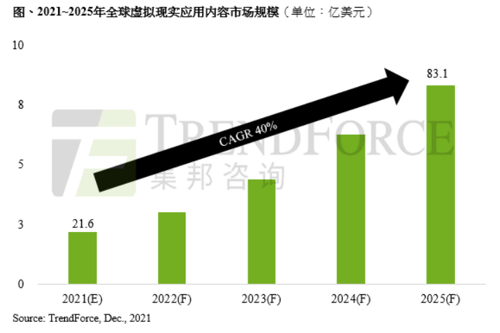 12月8日消息,集邦咨询发布公告称,随着元宇宙的议题在2021年迅速增温,以及使用者生成内容(UGC)概念受到关注,再加上AR/VR装置的出货量增长加速,将带动市场创造更多虚拟实境的应用内容。根据TrendForce集邦咨询 预估,2021年全球虚拟实境应用内容市场规模将达21.6亿美元,至2025将达83.1亿美元,年复合成长率为40%。