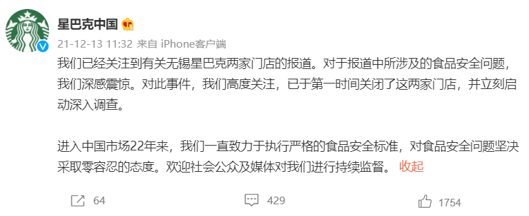 对此,星巴克中国官方微博回应称,我们高度关注,已于第一时间关闭了这两家门店,并立刻启动深入调查。