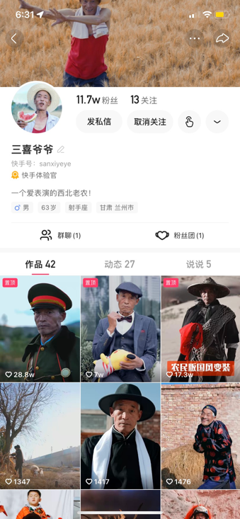 这位老人更为人熟知的名字是“三喜爷爷”,今年65岁的他7月份开始在快手短视频平台分享自己的生活,短短几个月的时间,就收获了十几万粉丝的关注,以及上百万个点赞。最开始,三喜爷爷的视频展现的是他和外孙们在田间地头、阵阵稻香中嬉戏玩乐的天伦之乐;而后,他逐渐发布了一系列换装视频,时而化身上海外滩西装革履的老克腊,时而变为民国年代军装笔挺的西北军阀。荒漠侠客那条视频下,有网友留言问:“大侠您还缺小弟吗?”三喜爷爷秒回:“缺。”