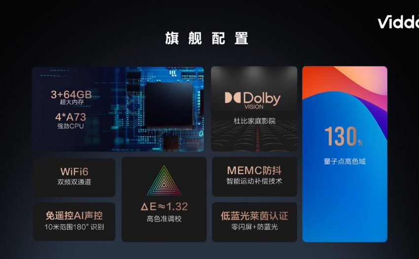 屏幕方面搭载了具有130%广色域的65英寸量子点屏幕,支持Dolby Vision和MEMC技术,画面色彩比普通电视更丰富艳丽生动,MEMC也可以让电视画面更加顺滑。