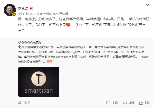 罗永浩:年后将回归科技界,不做手机,下一代平台见