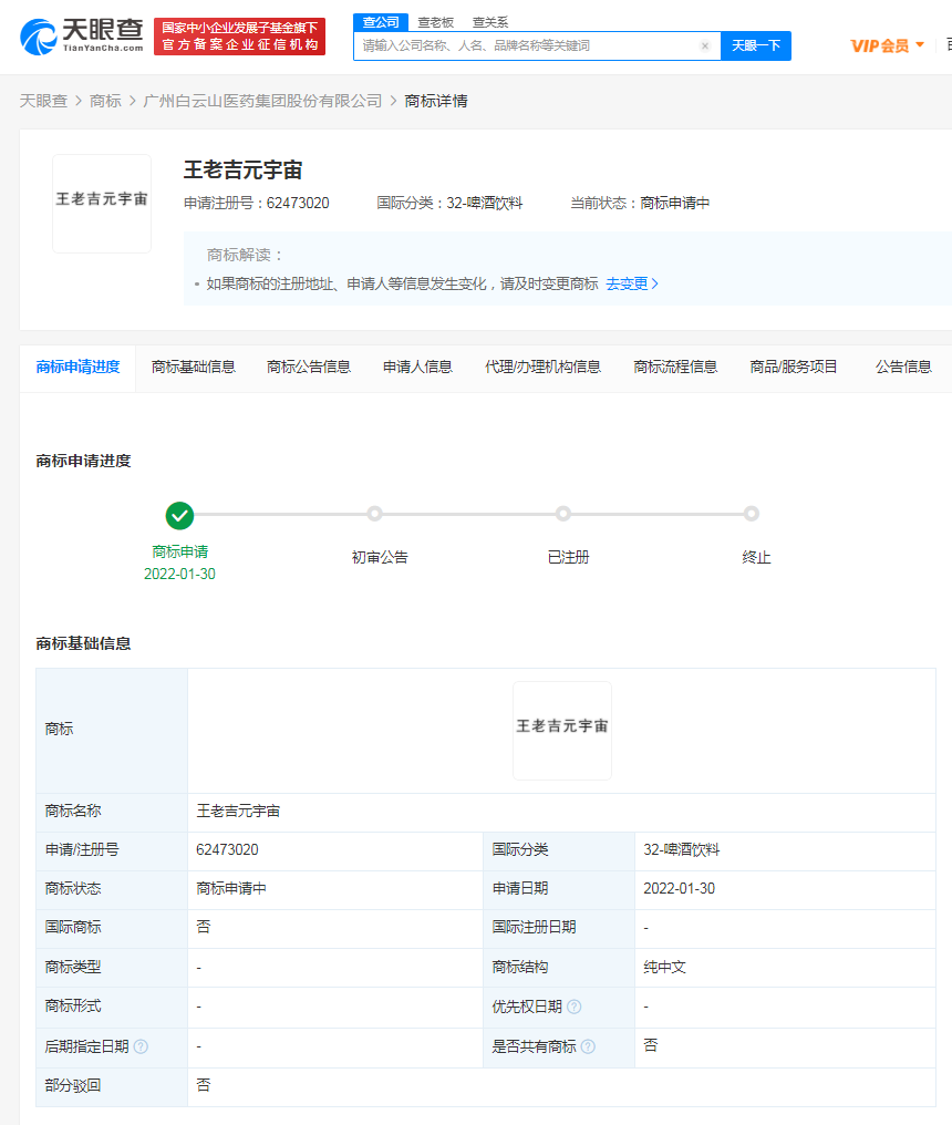 天眼查App显示,近日,王老吉关联公司广州白云山医药集团股份有限公司申请注册“王老吉元宇宙”商标,国际分类为啤酒饮料,当前商标状态为申请中。(速途网)