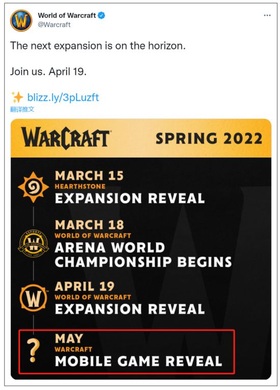 另据《魔兽世界》官方推特内容显示,3月15日将会公布《炉石传说》新资料片;3月18日将开启《魔兽世界》竞技场世界锦标赛;4月19日将公布《魔兽世界》资料片;5月份将发布全新的《魔兽》手游的消息。