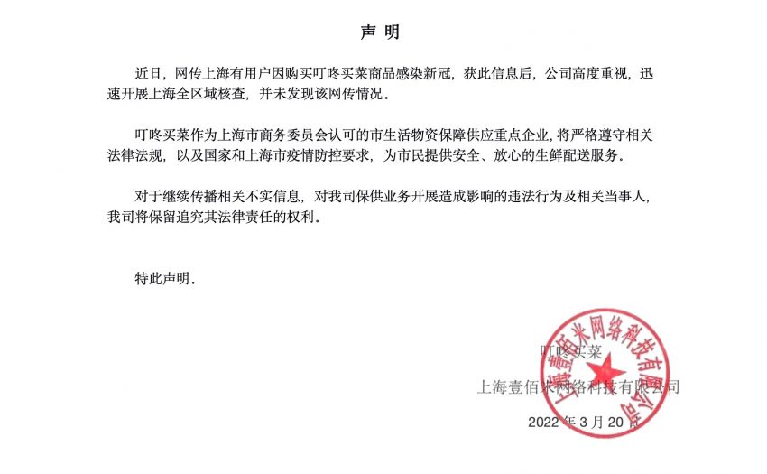 叮咚买菜强调,作为上海市商务委员会认可的市生活物资保障供应重点企业,将严格遵守相关法律法规,以及国家和上海市疫情防控要求,为市民提供安全、放心的生鲜配送服务。对于继续传播相关不实信息,对公司保供业务开展造成影响的行为及相关当事人,叮咚买菜将保留追究其法律责任的权利。