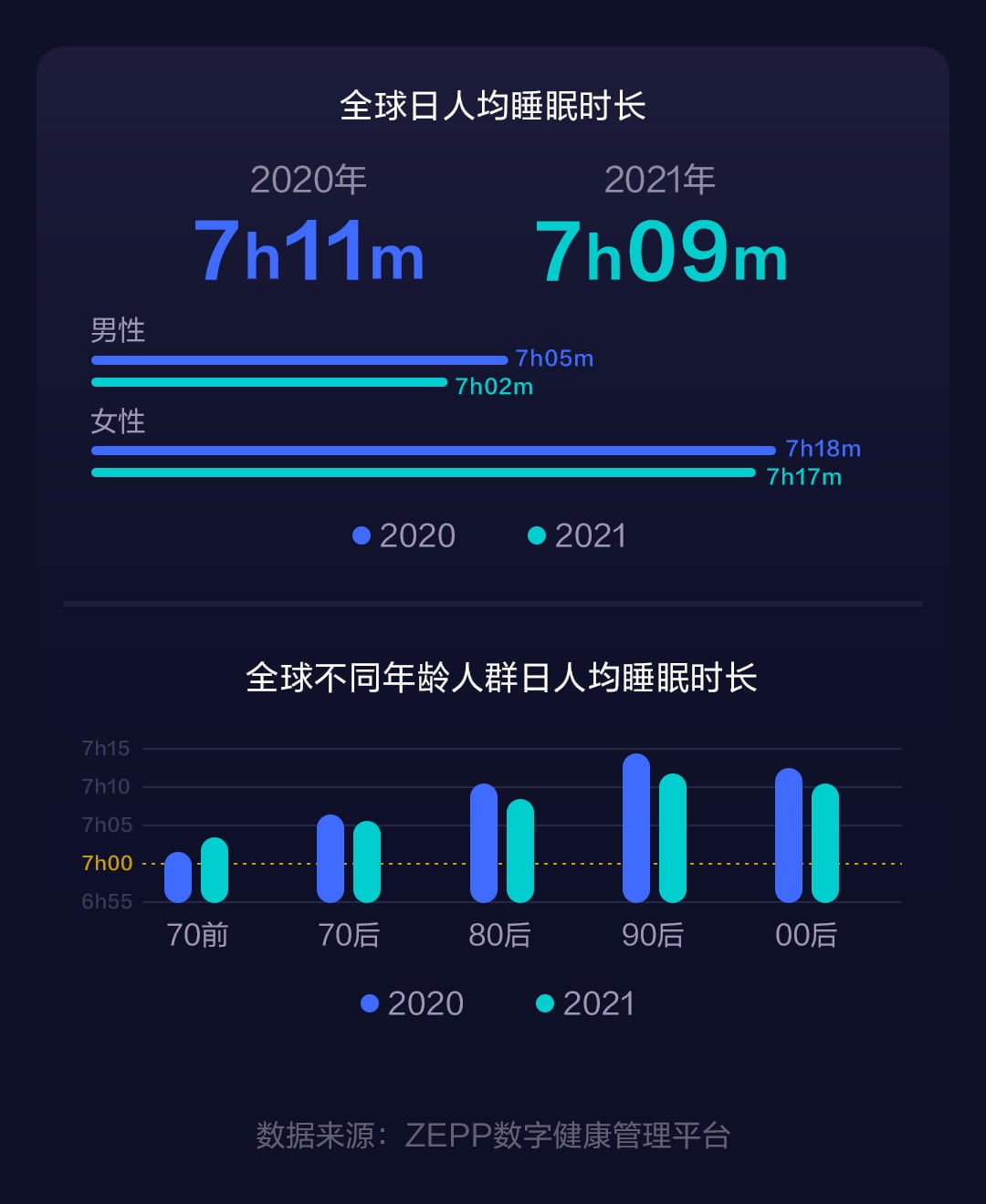 数据显示,在本次白皮书覆盖到的国家和地区中,2021年全球平均每人每天睡眠时长为7小时9分钟,相较2020年减少了2分钟。男性睡眠时长少于女性,90后人群睡眠时间最长,70前夜间睡眠时长最少,但各年代段中只有70前人群2021年日人均睡眠时长有所增加。