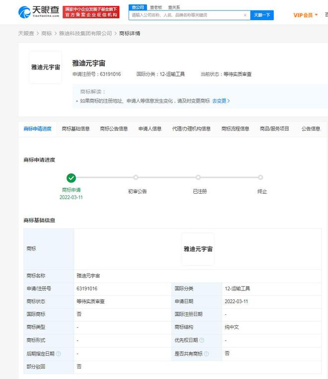 雅迪电动车申请元宇宙商标 速途研究院 • 2022年3月28日 16:22 • 元宇宙 速途元宇宙研究院3月28日讯 天眼查App显示,近日,雅迪科技集团有限公司申请注册“ 雅迪元宇宙”“小迪元宇宙”“换电兽元宇宙”“VFLY 元宇宙”“TTFAR 元宇宙”等商标,国际分类包括运输工具、广告销售等,当前商标状态为等待实质审查。 雅迪 赞 (0) 速途研究院 0 生成海报 丁香学堂线下沙龙走入江城,帮医生放大专业知识价值 上一篇 2022年3月28日 15:53 蚂蚁集团推出可信密态计算技术,可支撑隐私计算落地大规模数据场景 下一篇 2022年3月28日 17:29