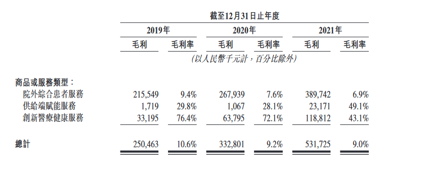 不过,高昂占比的药品销售数量带来的利润却寥寥无几。招股书显示:作为营收主要来源的院外综合患者服务,其销售成本则主要为商品成本,运送及包装成本基本可以忽略不计。招股书显示:2019年至2021年,院外综合患者服务的商品成本分别为98.7%、98.5%及96.1%。
