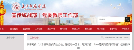 据潇湘晨报综合 5月18日,记者从长沙师范学院了解到,关于网传“大学确认曾发安全公告,警惕唯一艺术、绿洲宇宙、ibox等属电信网络诈骗”信息,长沙师范学院发表声明。声明中称,并未接到任何具有资质的记者的正式采访,同时也未发布任何官方公告提及任何企业涉嫌电信网络诈骗。具体如下: