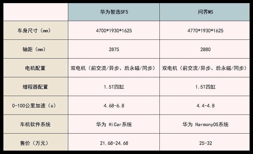 相较于赛力斯SF5,问界M5采用了华为 DriveONE 纯电驱增程平台以及全新鸿蒙OS 智能座舱。按照余承东的说法,“这次我们用了华为消费者业务的工业设计团队、软件团队、用户体验团队来一起打造(问界M5)这个产品”。数据显示:2021年3月起,华为的团队逐渐渗透于小康,包括研发团队在内,目前人数已达到四五百人。也就是说,问界M5是一款”华为属性”极强的产品。