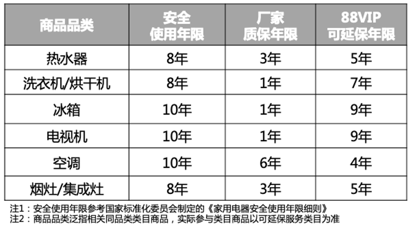 以往,大家电不同品类的商品,有不同的安全使用年限,厂家也会提供不同年限的质保。例如冰箱,法定安全年限是10年,厂家质保是1年。消费者要想延长保修期限,需购买延保服务。这次618,天猫直接把88VIP用户的冰箱保修期限免费延长到了10年。