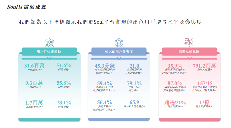 据招股书显示,2021年Soul月活跃用户及日均活跃用户数目分别为3160万名及 930万名,分别按年增长51.6%及55.8%。值得注意的是,2021年Soul月活跃用户中有74.9%为Z世代。每名日活用户的日均花费时长为45.3分钟。